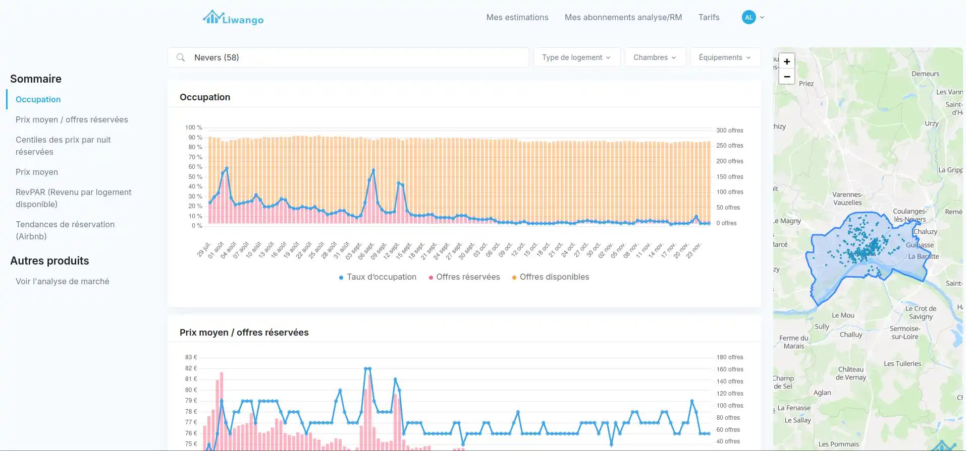 Obtenez une analyse complète et détaillée des performances des locations de courte durée sur le secteur choisi. Découvrez les chiffres clés du marché et mettez-les au service de décisions éclairées pour faciliter votre gestion locative au quotidien.